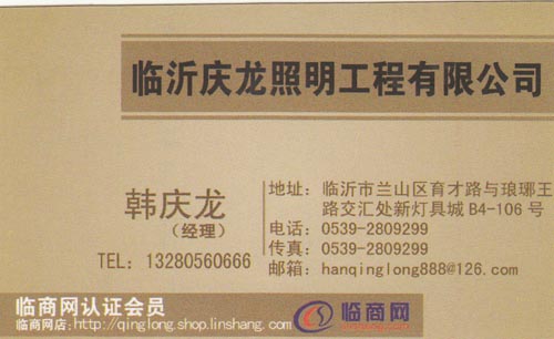 | 临沂庆龙照明工程有限公司 (您是第1021位游客 本企业暂无管理员[申请管理] 更新日期 2010-4-27 ) |